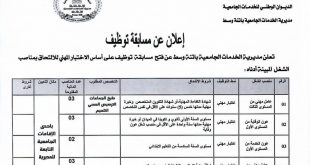 الجمهورية الجزائرية الديمقراطية الشعبية وزارة التعليم العالي والبحث العلمي الديوان الوطني للخدمات الجامعية مديرية الخدمات الجامعية باتنة وسط ads إعلان عن مسابقة توظيف تعلن مديرية الخدمات الجامعية باتنة وسط عن فتح مسابقة توظيف على أساس الاختبار المهني للالتحاق بمناصب الشغل المبينة أدناه: الرقممنصب الشغلنمط …