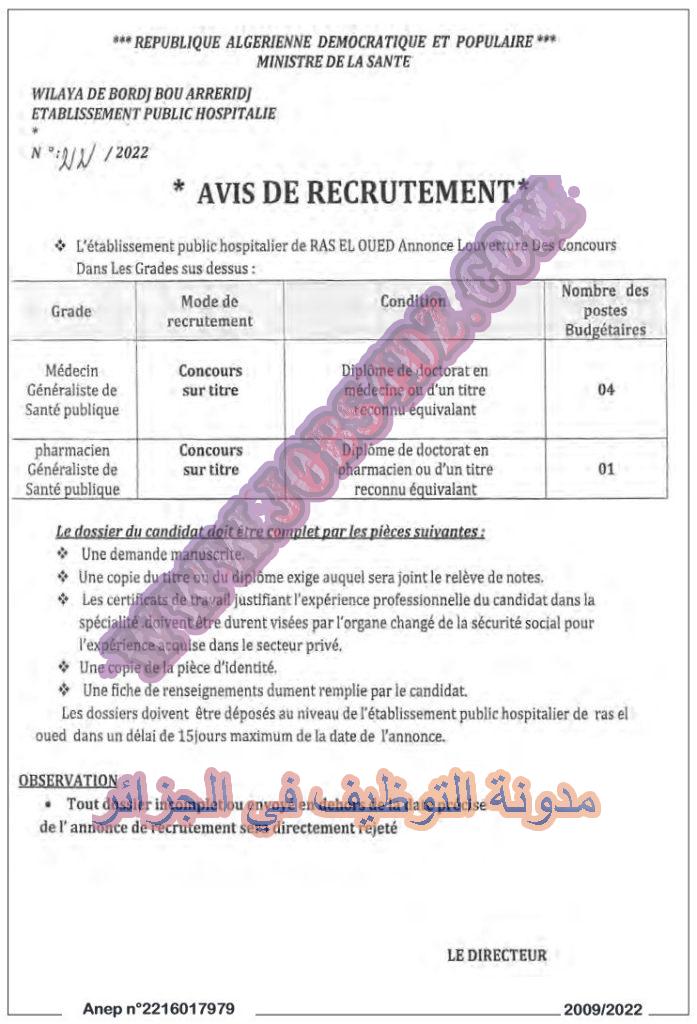 تعلن المؤسسة العمومية الاستشفائية راس الواد برج بوعريريج عن فتح مسابقة توظيف على اساس الشهادة في الرتب المبينة ادناه