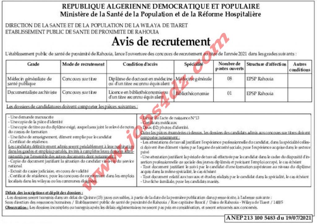 تعلن المؤسسة العمومية للصحة الجوارية الرحوية ولاية تيارت. عن فتح مسابقة توظيف على اساس الشهادة في المناصب التالية