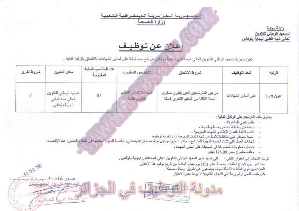 يعلن مديرية المعهد الوطني للتكوين العالي شبه الطبي لبجاية عن فتح مسابقة توظيف على اساس الشهادة في الرتب المبينة ادناه