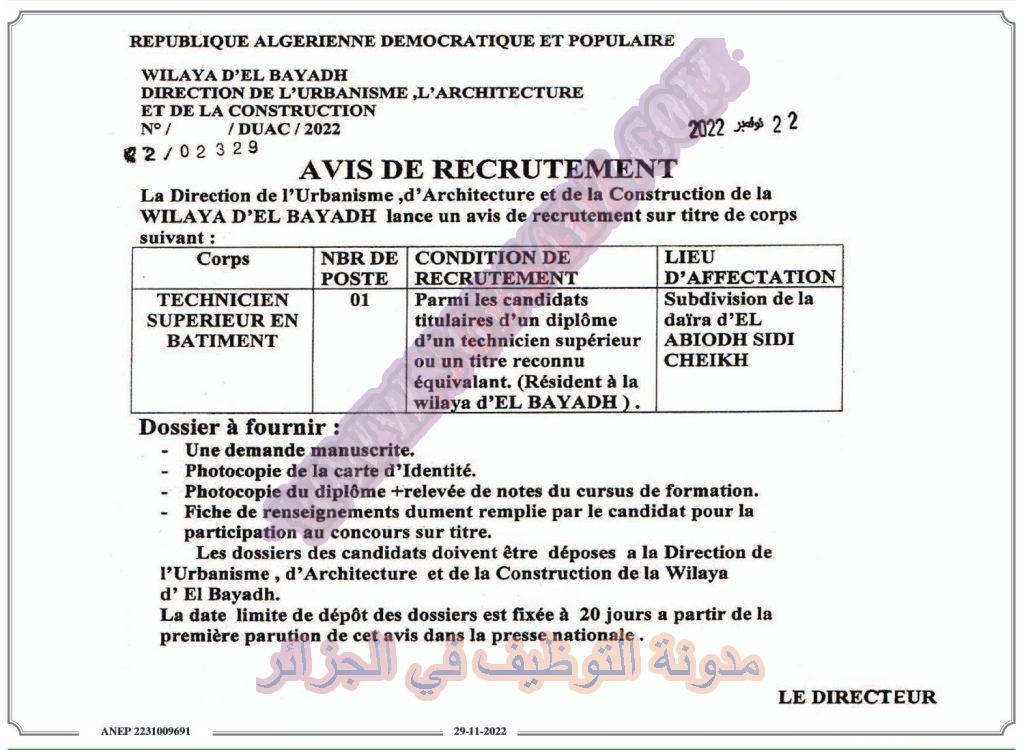 تعلن مديرية التعمير و الهندسة المعمارية و البناء لولاية البيض عن فتح مسابقة توظيف على اساس الشهادة في الرتب المبينة ادناه