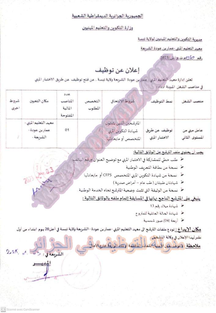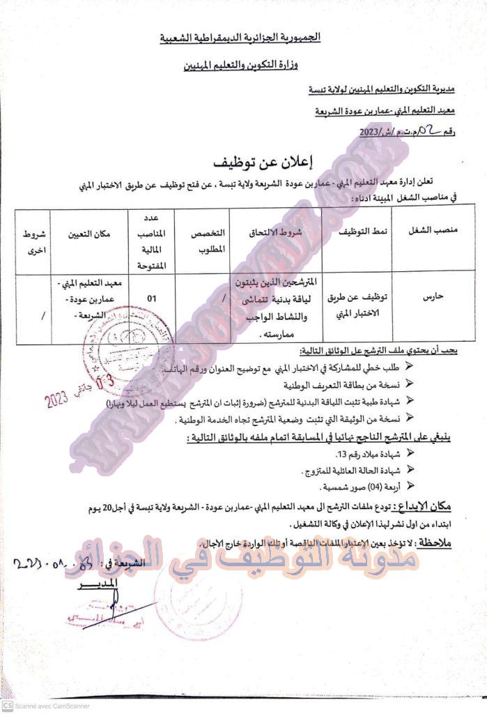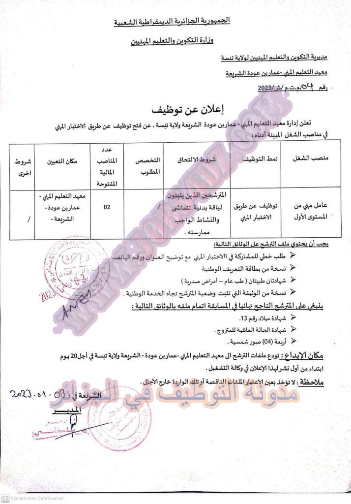 اعلان توظيف بمعهد التعليم المهني بالشريعة تبسة