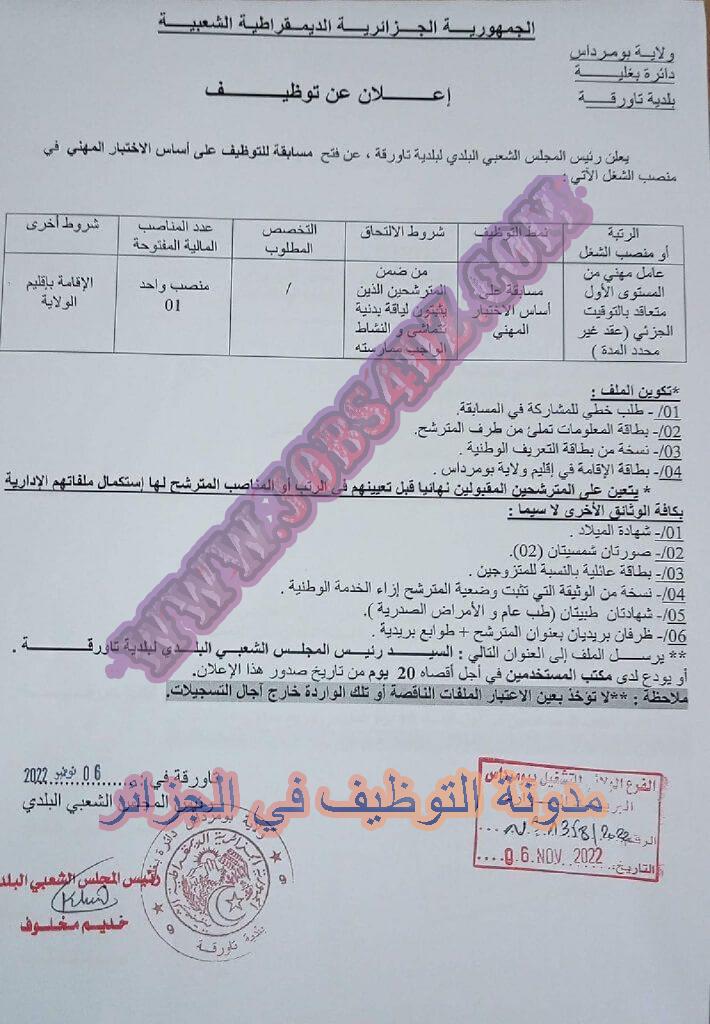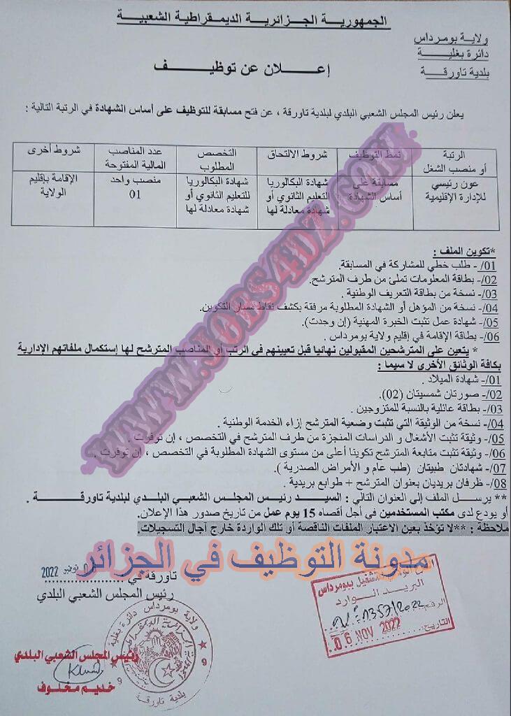 يعلن رئيس المجلس الشعبي البلدي لبلدية تاورقة بومرداس عن فتح توظيف خارجي على اساس الشهادة وعلى اساس الاختبار المهني في الرتب المبينة ادناه