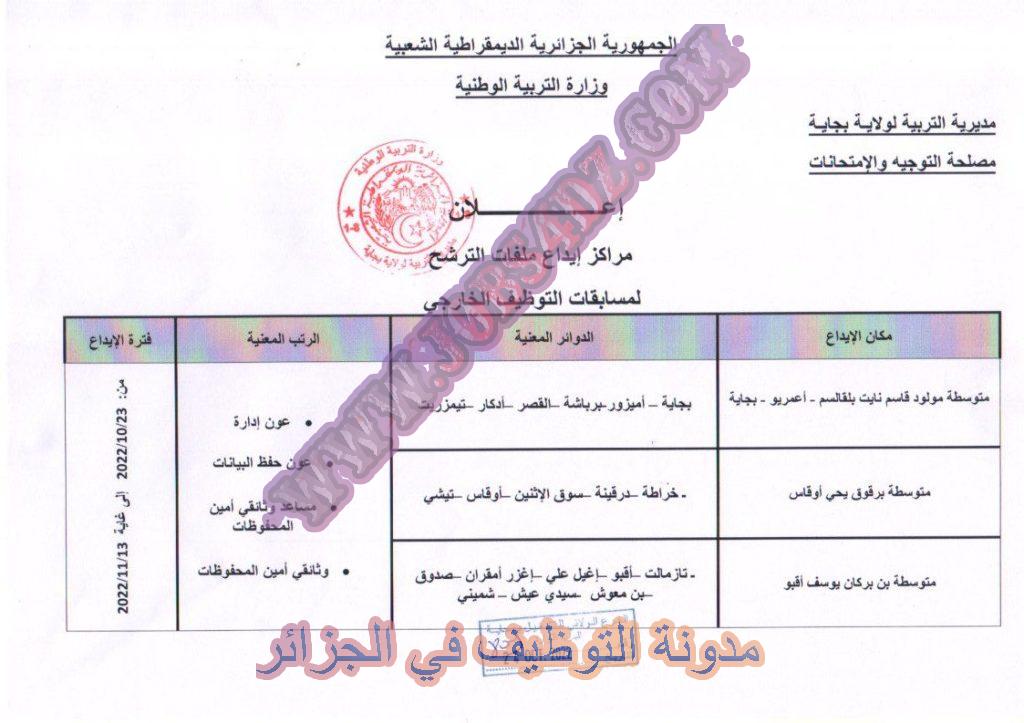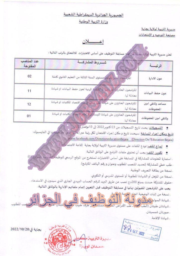 تعلن مديرية التربية لولاية بجاية عن فتح توظيف على اساس الاختبارات في الرتب المبينة ادناه