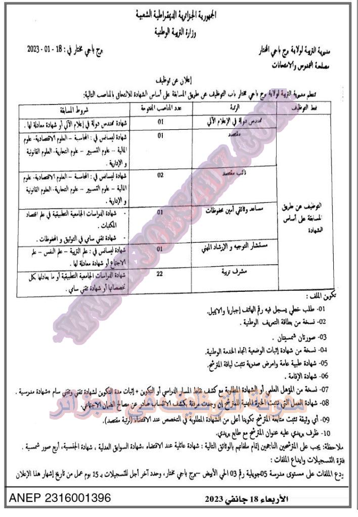 تعلن مديرية التربية لولاية برج باجي مختار عن فتح مسابقة توظيف على اساس الشهادة في الرتب المبينة ادناه