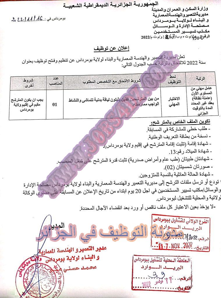 تعلن مديرية التعمير و الهندسة المعمارية لولاية بومرداس عن فتح توظيف عن طريق الاختبار المهني في الرتب المبينة ادناه