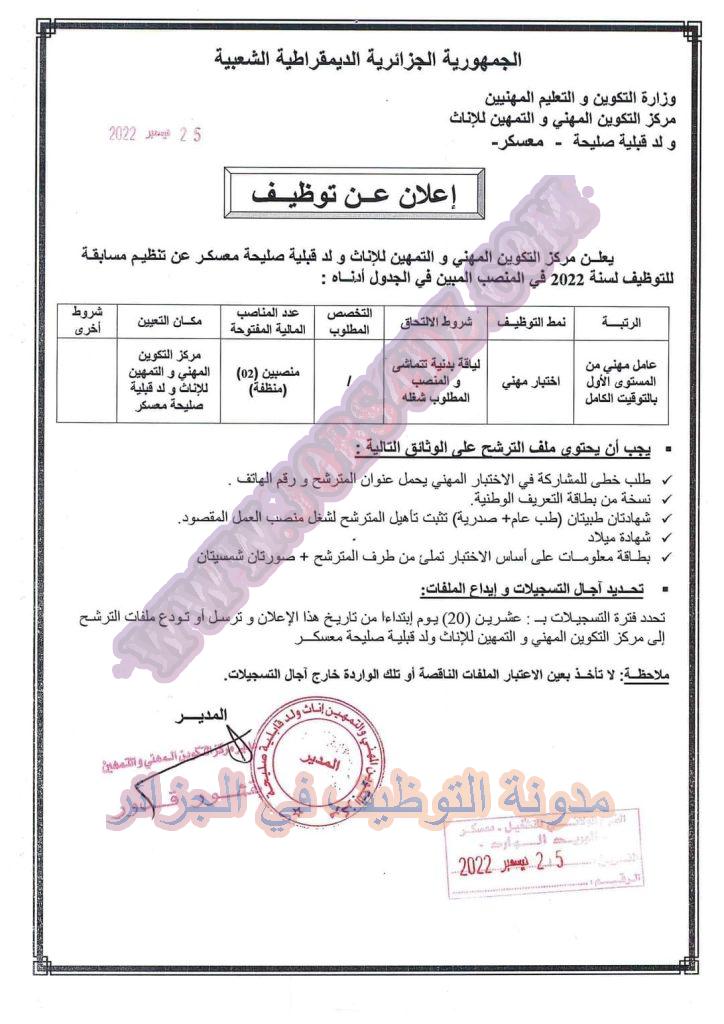 يعلن مركز التكوين المهني والتمهين للاناث ولد قبلية صليحة بمعسكر عن فتح مسابقة توظيف على اساس الاختبار المهني في الرتب المبينة ادناه