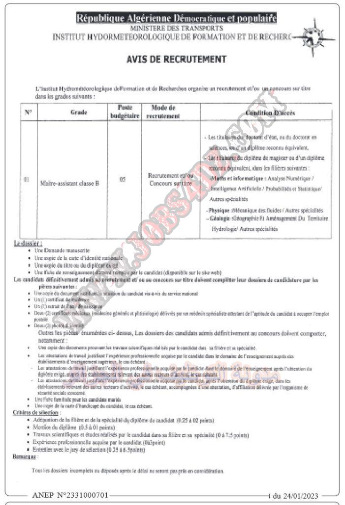 يعلن معهد رصد مياه الأمطار للتكوين والابحاث عن فتح مسابقة توظيف على اساس الشهادة في الرتب المبينة ادناه