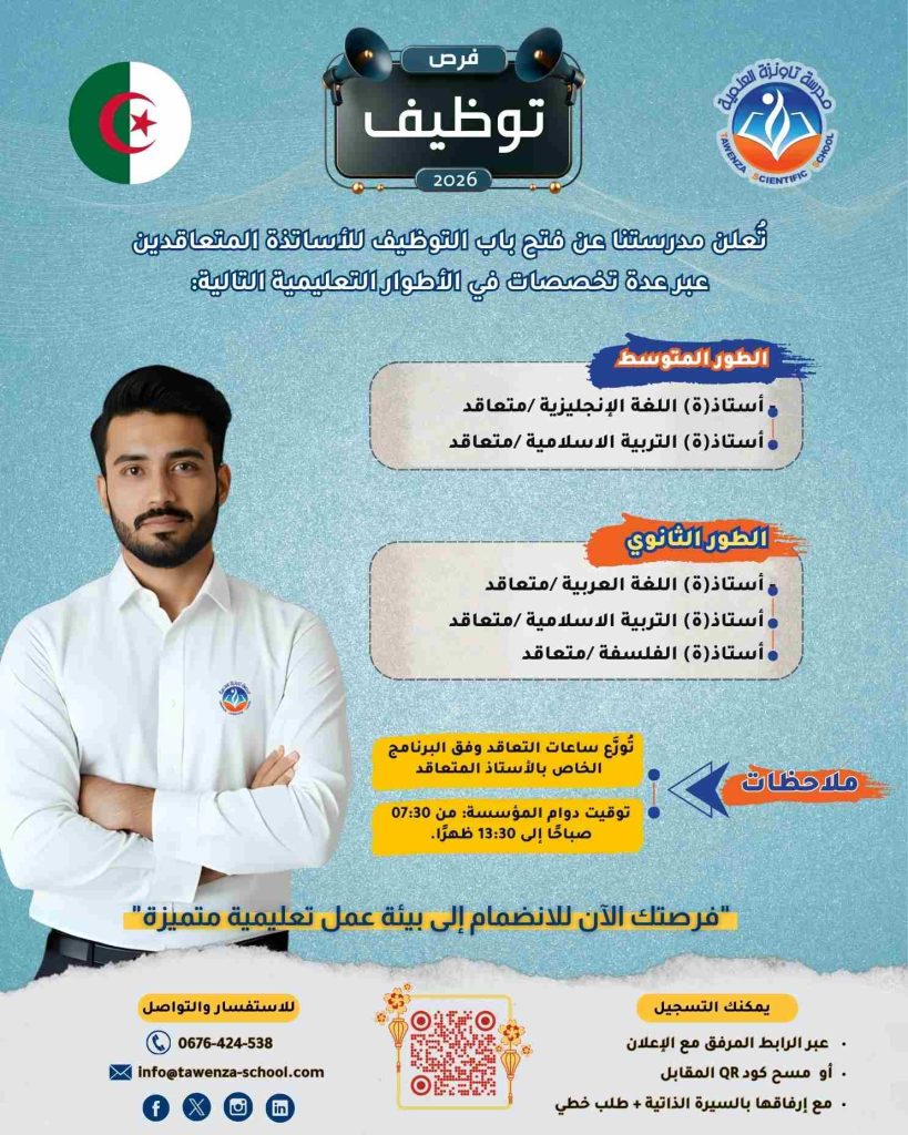 تعلن المدرسة عن فتح باب التوظيف للأساتذة المتعاقدين عبر عدة تخصصات في الأطوار التعليمية التالية: