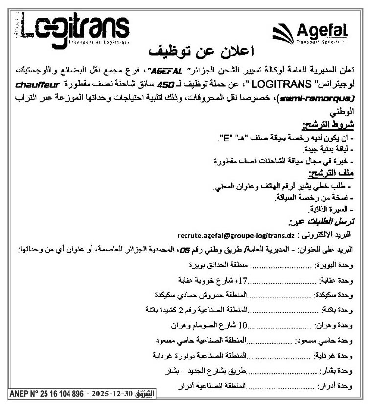 تعلن المديرية العامة لوكالة تسيير الشحن الجزائر “AGEFAL”، فرع مجمع نقل البضائع واللوجستيك “LOGITRANS”، عن حملة توظيف لـ 450 سائق شاحنة نصف مقطورة (chauffeur semi-remorque)، خصوصا نقل المحروقات، وذلك لتلبية احتياجات وحداتها الموزعة عبر التراب الوطني.